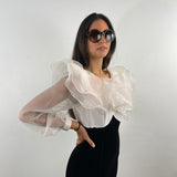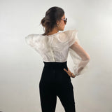 This unforgettable piece features a voluminous sheer white flounced collar, elegant balloon sleeves, and sleek velvet pants that elongate your silhouette. It’s the perfect balance of sophisticated, playful, comfortable, and edgy—a standout look that captures the spirit of the era while feeling timeless today.